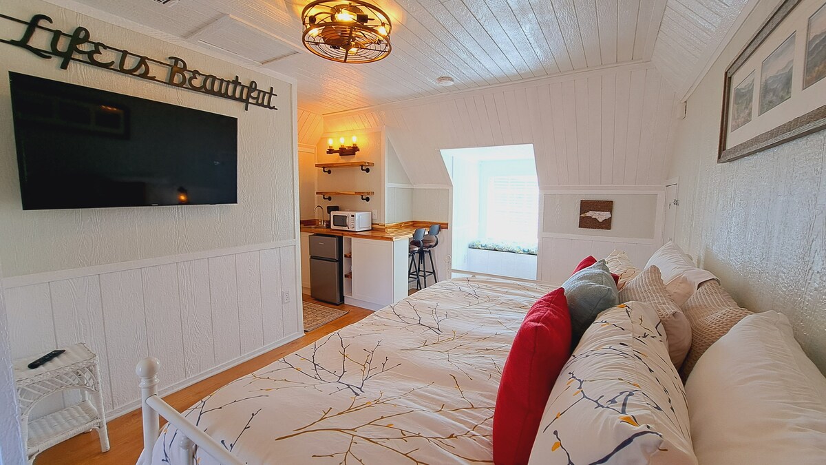Mismo alojamiento, diferentes sitios web: ¡ahorra en las tarifas! Pista: No solo estamos en Airbnb 😉 Quedate en un pedazo de historia en Historic Shelton House Carriage House, administrado por Carolina Mountain Vacation Homes. A solo 3 cuadras del centro de Waynesville, esta encantadora suite en el piso superior ofrece 1 cama tamaño king, 1 cama tamaño queen, TV Roku, WiFi Spectrum y vistas a la montaña. Se admiten mascotas para un perro pequeño. ¡Caminá hasta las tiendas, las cervecerías y el mercado de productores!