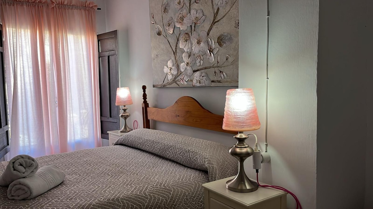 A cozy and spacious room with natural wood furniture, a fan and air conditioning. A perfect getaway in a white Spanish village in the heart of Andalusia. Surrounded by mountains speckled with olive trees for as far as the eye can see. An ideal place to escape the hustle and bustle of cities, and perfect as a base for exploring the region or remote-working. Common areas shared with the host and other guests include the living room, terrace, and a quiet working space.