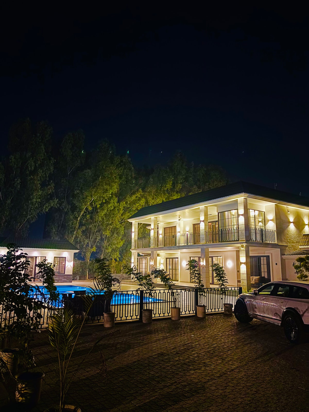 Set on four acres of private, landscaped land and enclosed by a secure boundary wall, this neoclassical mansion offers an exclusive retreat. Inspired by classical European estates, its symmetrical façade, tall columns, and grand entrance create an immediate sense of elegance. Designed for Airbnb stays, the mansion features spacious living areas, luxurious bedrooms, and modern comforts. Expansive lawns and open spaces provide privacy and the perfect setting for memorable stays and celebrations.
