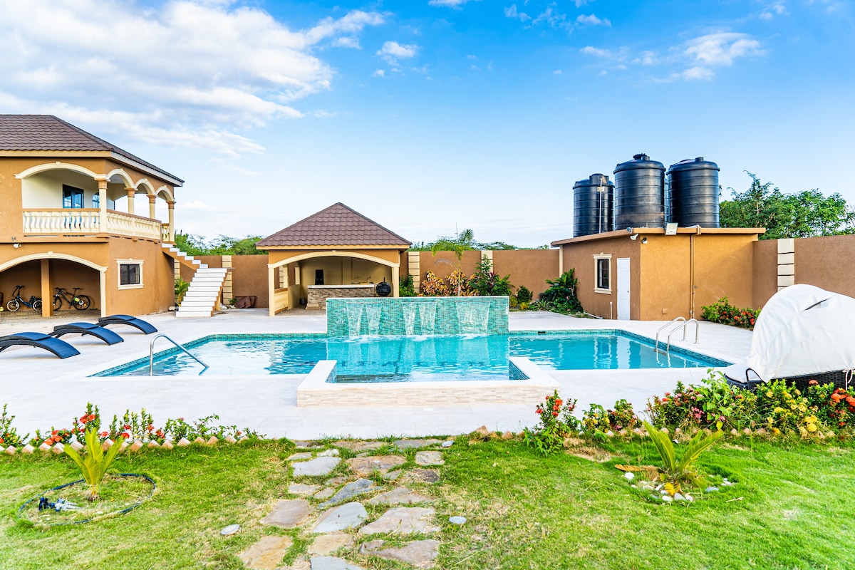Welcome to BayWatch Villa – a 4BR luxury retreat in Montego Bay. Marvel at breathtaking views of the harbor and Caribbean Sea both day and night. Share unforgettable moments with family and friends. Enjoy spacious living spaces, a modern kitchen, and laundry convenience on premises. Stay connected with Wi-Fi throughout, even by the pool. With solar backup, you’ll always have power for the essentials. Note: AC is not available on backup power.