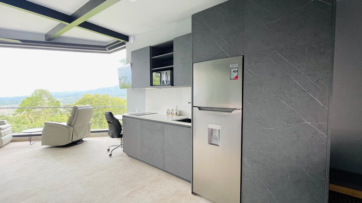 Luxurious one bedroom apartment with incredible view from above to town at CASA EJECUTIVA BOQUETE. A full kitchen, 1.5 bathrooms, 2 king sized beds, 1 queen bed and section to entertain guests. It has a full wrap around balcony and is extremely secure, with the only entrance being a single heavy oak door. Fast primary internet connection (~100mbps), backup internet connection, solar panels, and water tanks on site. We never lose water or power. No stairs for this apartment.