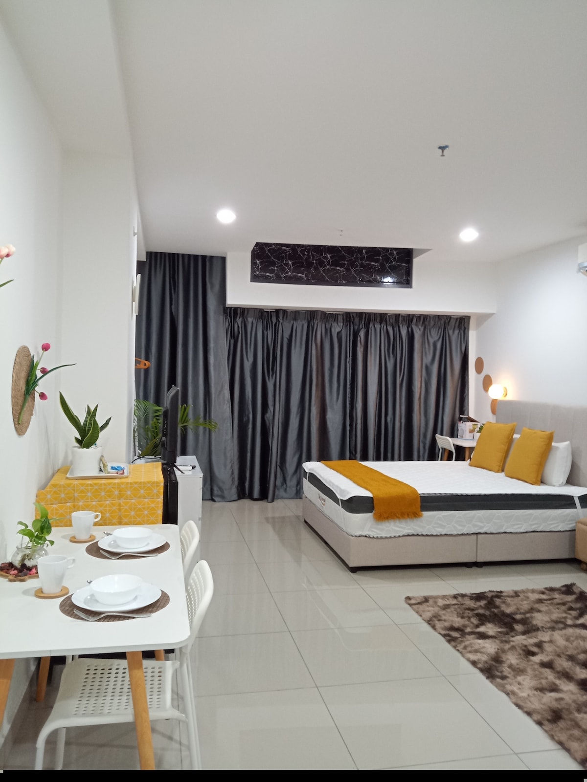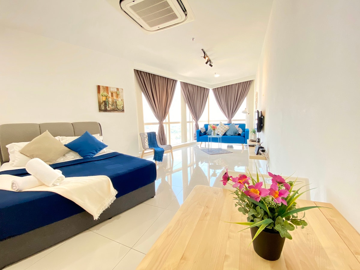 ☆Brand NEW Modern & Cozy Studio COMPLIMENTARY ♡♡ COWAY hot & cold water ♡♡ Instant Noodles Cups ♡♡ Fresh Mint Candy ☆Fully Furnished Studio ●42-inch smart TV with streaming services like Netflix ●Fully equipped kitchen with hood & hob ●2 doors fridge ●Queen size bed ●Lazy sofa ●Dining table & chairs ●Coway Water Dispenser ☆ Practicalities ●Free 1 parking lot and high-speed Wi-Fi, adding to the convenience for guests ☆Facilities ●Swimming Pool ●Swing Chair infront unit door step
