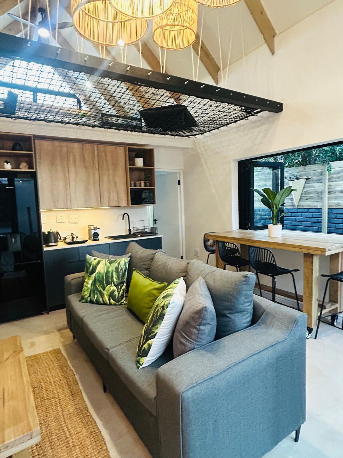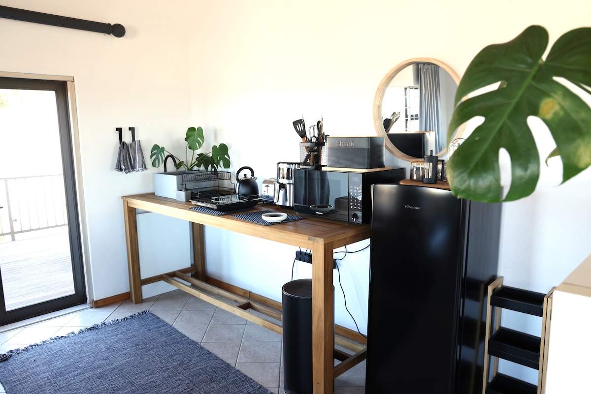 Un estudio espacioso, de planta abierta y estilo loft, con capacidad para 2 personas. Perfecto para una pareja o un viajero soltero. Tranquilamente apartado de la carretera principal y a poca distancia a pie de la playa, es el lugar perfecto para una escapada, una misión de surf o una estancia de negocios. Entrada independiente a un patio con vista directa a Lowerpoint. Saborea espectaculares amaneceres mientras disfrutas de una taza de café por la mañana o disfruta de un braai en el patio con atardeceres, mientras observas las olas y avistas delfines.