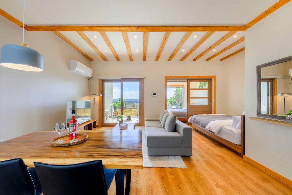 A charming ocean-view accommodation where unforgettable sparkling reflections of the blue sea and the horizon is stretching across the floor to ceiling window. 5min walk is the Keuneong trail, like a secret garden, allowing you to enjoy dreamlike morning strolls while listening to the sounds of birds and waves every day. Enjoy the ocean view and sunrise in winter at your private terrace. [Prime Location] Centrally located on the south coast, U+Sea is ideal for exploring both the East and West.
