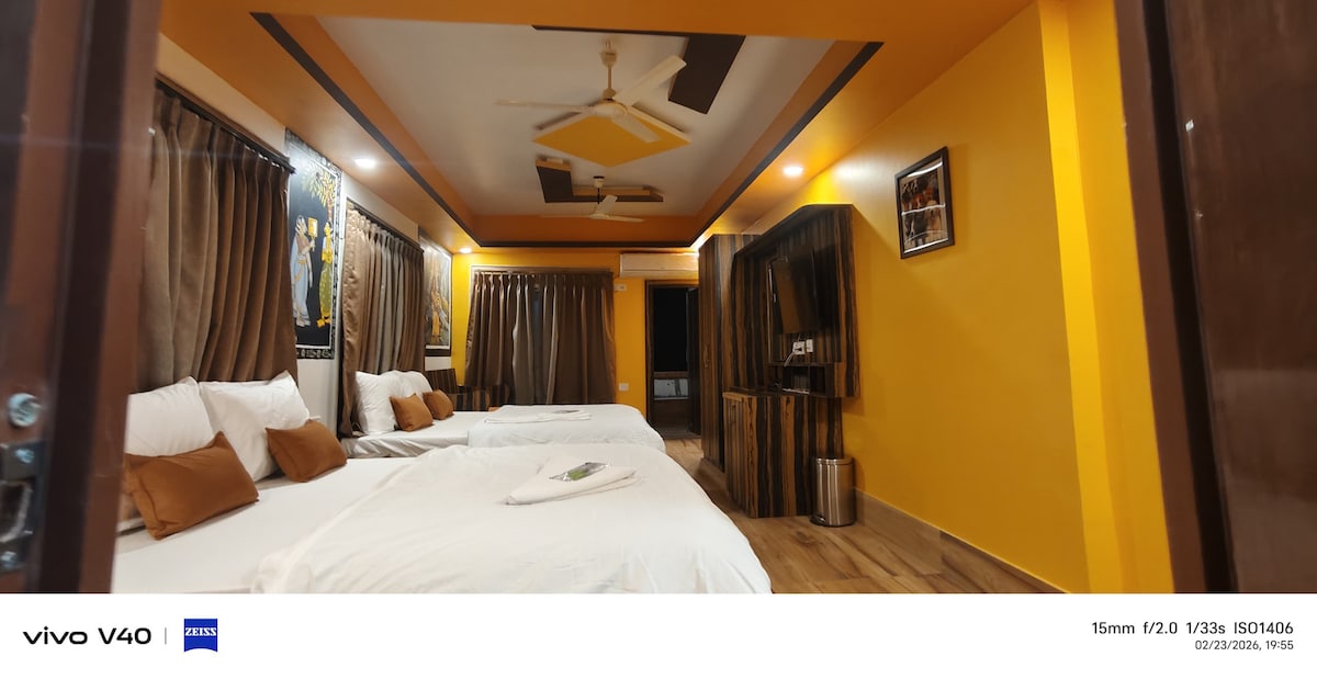 The Premium Room at Hotel Dinantika offers spacious comfort with two double beds, ideal for families. Each room features an attached modern bathroom, tasteful décor, and essential amenities for a relaxing stay. Designed for convenience and warmth, it blends functionality with elegance, ensuring guests enjoy privacy, comfort, and easy access to Shantiniketan’s cultural charm. Perfect for family travelers seeking both value and quality.