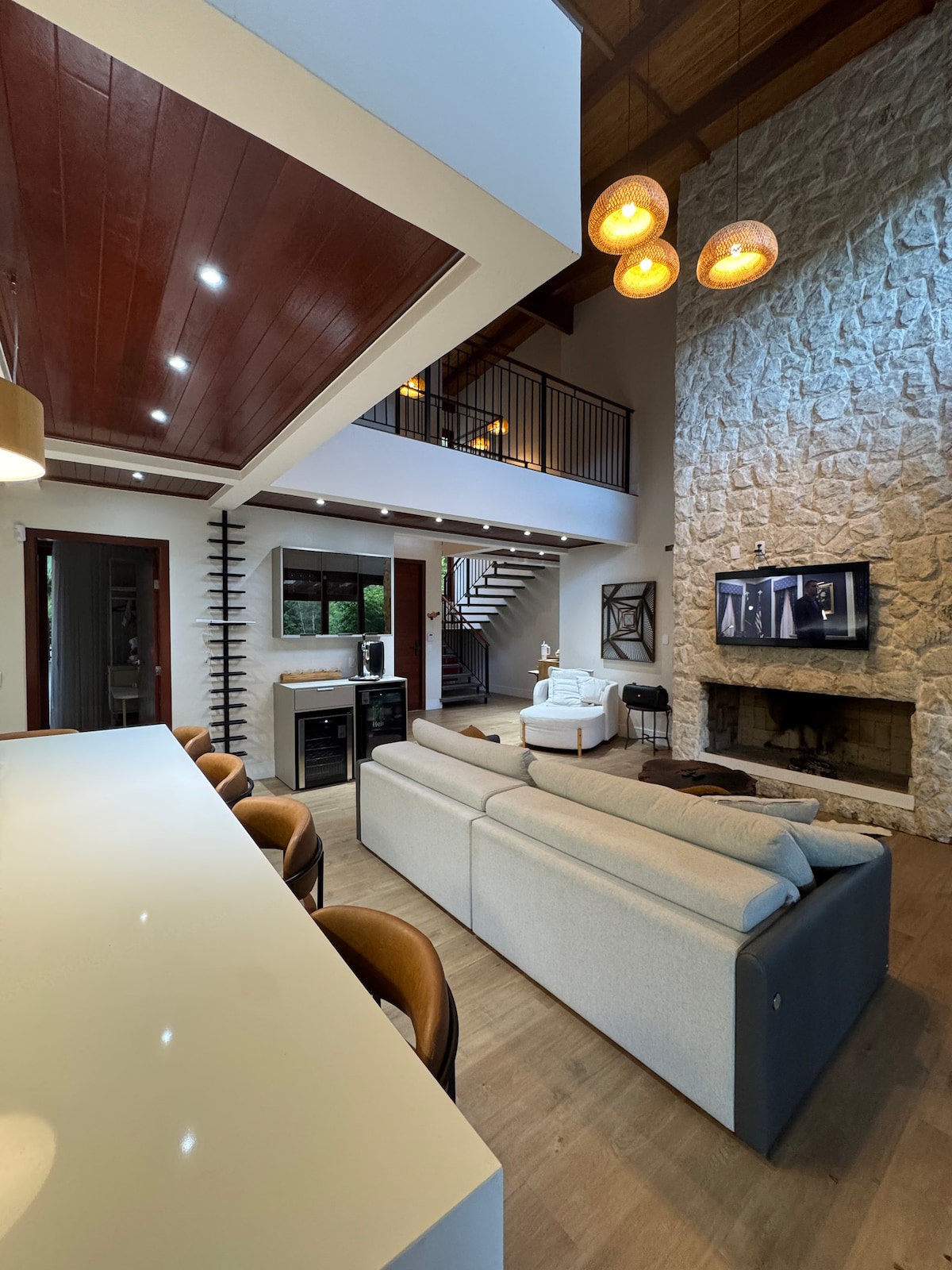 Retiro de alta gama en Estrada Bonita, Joinville/SC. Casa moderna con chimenea, jacuzzi, área gourmet y vista al lago. Cocina completa, cervecería, bodega, parrillas interiores y exteriores, cancha de arena y mini bosques. Tiene capacidad para 6 personas cómodamente. Para grupos de más de 6 huéspedes, está disponible el chalet adjunto, un espacio separado con balcón y parrilla privada, lo que garantiza aún más comodidad y privacidad. Cerca de cascadas, restaurantes y cafés de la zona.