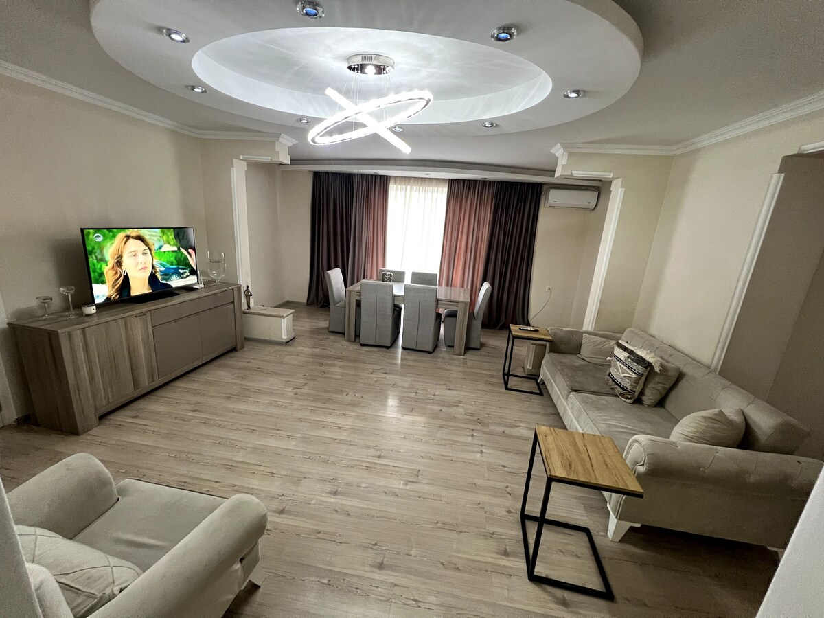 Amplia casa de 3 dormitorios en el centro de Telavi, a poca distancia (a 5-15 minutos) de tiendas y lugares históricos. Disfrutá de las vistas a la montaña, la terraza con comedor al aire libre y la cocina completa. Ideal para familias, parejas o grupos que exploran Kajetia. Wifi rápido, aire acondicionado en el dormitorio principal, 2 baños y sala de estar abierta. La propiedad está a 6-15 km de las mejores bodegas de la región y otros sitios históricos. Estacionamiento gratuito. No se permite fumar. El punto de partida ideal para disfrutar del vino, la cultura o un descanso.