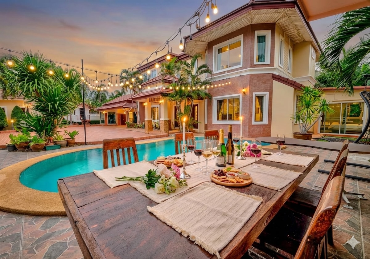 Escapada y retiro villa con piscina privada de 2 dormitorios (1 habitación cerrada con llave, compartida por el propietario), ideal para una estancia relajante o juguetona. • Piscina privada y jardín • Sala de juegos con simulación de carreras + TV de cine de 120pulgadas - Cocina completa para comidas caseras. • Parrilla en el jardín • A 5 minutos a pie de la playa. • A poca distancia del mirador y del templo de Buda. • A 5 minutos del muelle de Bali Hai. - A 2 minutos a pie de 7-11. • A 5 minutos en taxi de Walking Street. • Rodeado de restaurantes, cafés y bares locales - Se admiten mascotas. Perfecto para tus vacaciones.