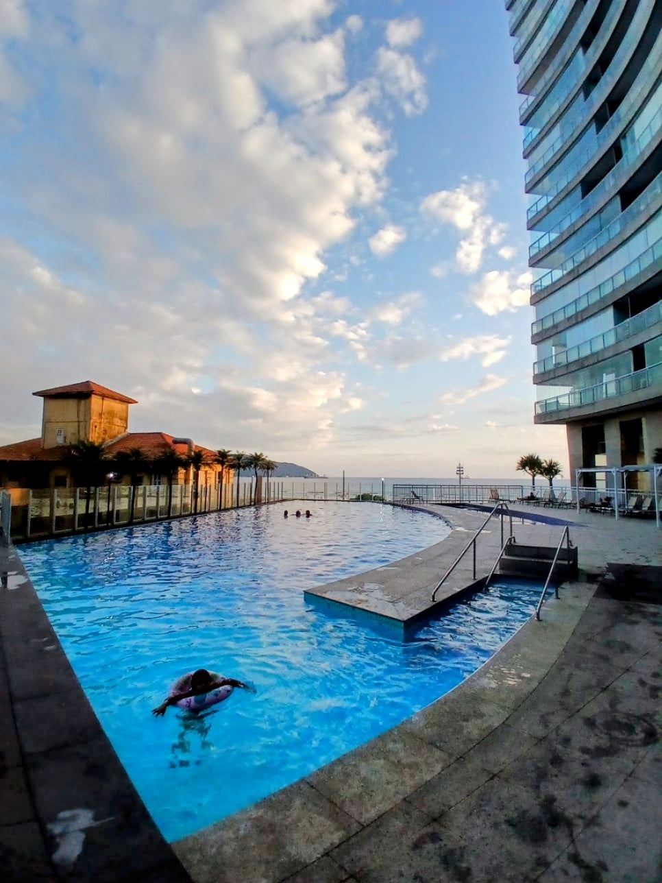 Moderno apartamento con aire acondicionado en la sala y en el dormitorio, cocina equipada, estufa, horno, microondas, Smart TV, Netflix, Wi-Fi, y un gran balcón con una vista exuberante de la playa de Santos. El condominio cuenta con una completa área de esparcimiento con dos increíbles piscinas, una climatizada y otra con borde infinito frente al mar.