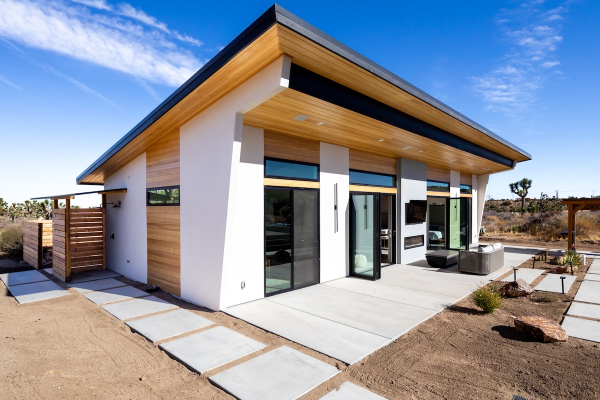 ▪︎ Sleek modern pool with heated spa and tanning shelf ▪︎ Dedicated wellness area with barrel sauna, cold plunge, shower, and Joshua Trees ▪︎ Stunning sunset and sunrise views with extensive outdoor seating areas featuring a fire sculpture All of our amenities are thoughtfully integrated into five private acres in the Joshua Tree area, offering uninterrupted desert views, exceptional night skies, and a rare sense of space and privacy, with a short drive to town and Joshua Tree National Park.