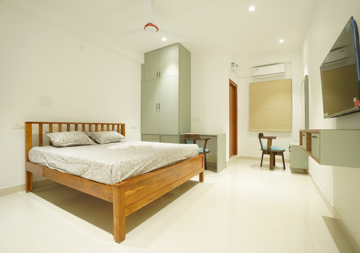 * Certificado desinfectado * Apartamentos con servicios de OLIVA: ¡casas galardonadas! Estudio privado de diseño en Gachibowli con jardín con terraza, aparcamiento y ascensor, a solo 5 minutos de Hitech City, AIG Hospital y Care Hospital. Ideal para trabajar desde casa: cama tamaño king en el dormitorio, escritorio, baño, sofá cama y mesa de comedor en la sala de estar y cocina completa con fogones, nevera, microondas, microondas, utensilios para cocinar, etc. Alquiler diario con todo incluido: Internet WiFi, TV TataSky, limpieza,lavadora, servicios públicos, respaldo de energía.