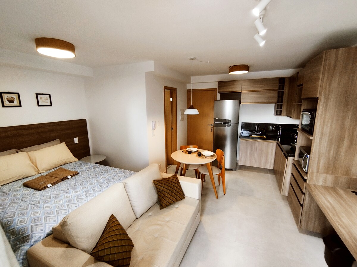 Apartamento tipo estudio nuevo con garaje. Todo el mobiliario es nuevo y está diseñado para brindar la máxima comodidad a nuestros huéspedes. Muy bien ubicado con todo cerca, en plena Av. Itamar Franco, casi en la esquina con la Av. Br. Rio Branco en el corazón de la ciudad! ¡Ideal para su oficina en casa combinada con el ocio! Con una completa zona de ocio con piscina, gimnasio, zona gourmet, coworking, espacio kids y lavandería. ¡Disfrute de una experiencia sin igual en este estudio bien ubicado con garaje!