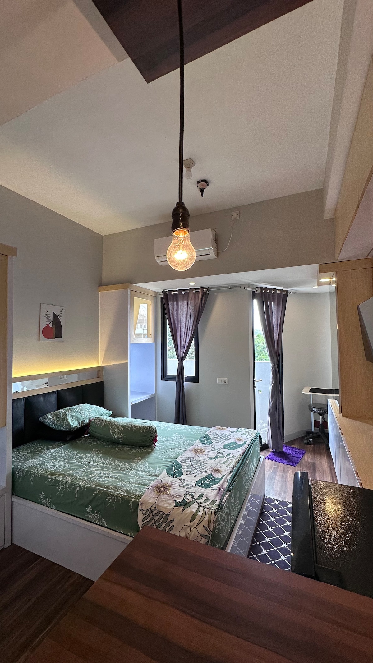 Apartamento tipo estudio de estilo minimalista pero cálido, estratégicamente ubicado cerca de varias universidades de renombre en Malang, como UMM, UNISMA, UIN, BRAWIJAYA, POLINEMA, ITN y a solo 5 minutos de la ciudad turística de Batu. Tiene una hermosa vista directa al monte Arjuno con instalaciones públicas completas como 2 piscinas (pública y privada para mujeres), gimnasio, pista de fútbol sala, minimercado y cafetería.