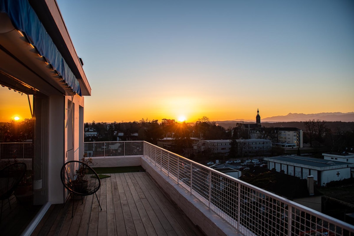 Bienvenue dans l'univers de Bed & Views ! La suite Panoramique est un appartement unique à Pau ! Niché au 7 ème et dernière étage de la résidence Trespoey, vous disposerez d'un appartement avec home cinéma , moderne et fonctionnel. Par beau temps, vous ne pourrez qu'apprécier le toit terrasse de 40 m2. Avec des vues exceptionnelles sur toute la chaîne des Pyrénées, vous vous sentirez très privilégié(e)s. Un véritable tableau vivant vous attend !
