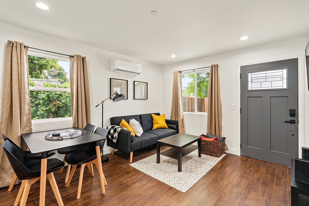 Nueva construcción 2 dormitorio y 1 baño moderno joya oculta! Esta casa de huéspedes tiene su propio patio privado, entrada y entrada. A poco menos de 600 pies cuadrados, no se dejó piedra sin girar al diseñar este espacio. Esta casa de concepto abierto cuenta con una sala de estar con un sofá cama, TV Roku de 50 pulgadas, mesa de comedor con 4 sillas, sistema de calefacción y aire acondicionado con control remoto. Cocina completa con microondas, horno, nevera y lavadora/secadora. Baño completo con bañera y ducha. 2 dormitorios, 1 con una cama queen y el otro w 2 camas individuales.