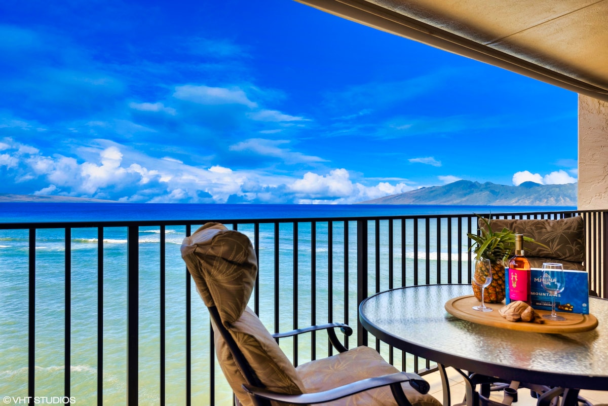 Mar 28 to Apr 3rd OPEN!! 🌺 5-star Maui Oceanfront Penthouse | Corner Unit with Epic Views of the ocean and the mountains! 🐋 Experience breathtaking sunsets from this top-floor corner unit 2BR, 2BA condo 🌊 with panoramic views of the Pacific, Lanai, Molokai & West Maui Mountains 🏔️. Spot whales 🐋 and turtles 🐢 right from your lanai! Walk to beaches, restaurants, and shops. Soak up the sun, swimming in the pool or BBQ under the palm trees. ✅ Book now for the best rates!