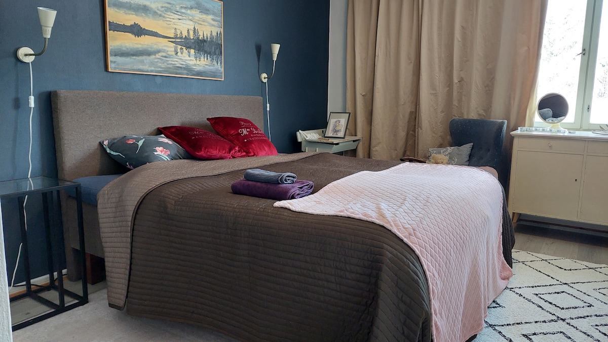 Apartamento de dos habitaciones con sauna bien situado. Cerca hay pistas de esquí iluminadas y rutas para hacer ejercicio al aire libre. La ropa deportiva se puede lavar en la lavadora y secar en la secadora. Después de correr, puedes relajarte en la sauna. Hay un cobertizo para su coche con un enchufe para calefacción. No es posible cargar coches eléctricos e híbridos. El punto de carga más cercano se encuentra en el patio del supermercado S-Market cercano. La limpieza final del apartamento es responsabilidad del inquilino. Por favor, traiga su propia ropa de cama y toallas.