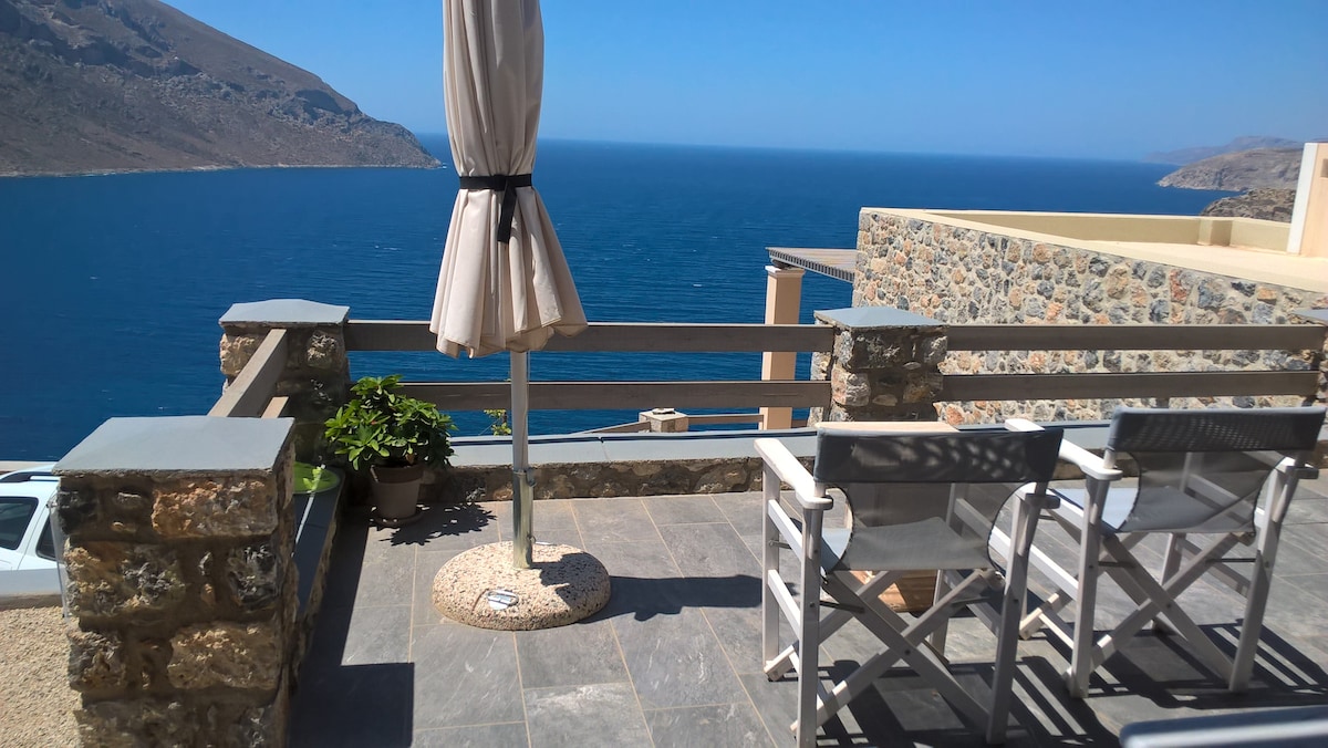 Marialena's House is a comfortable seaside house very close to the sea, on the quiet beach of Myrties. Enjoy moments of relaxation and tranquility by the sea and the unique view from the living room and the outdoor terrace that we have created combining tradition with modern comforts. Bathed in light, with unlimited views of the sea and the island of Telendos, built with love and care. A renovated holiday home that has it all in abundance: space, comfort, sky, sea, mountain & free parking.