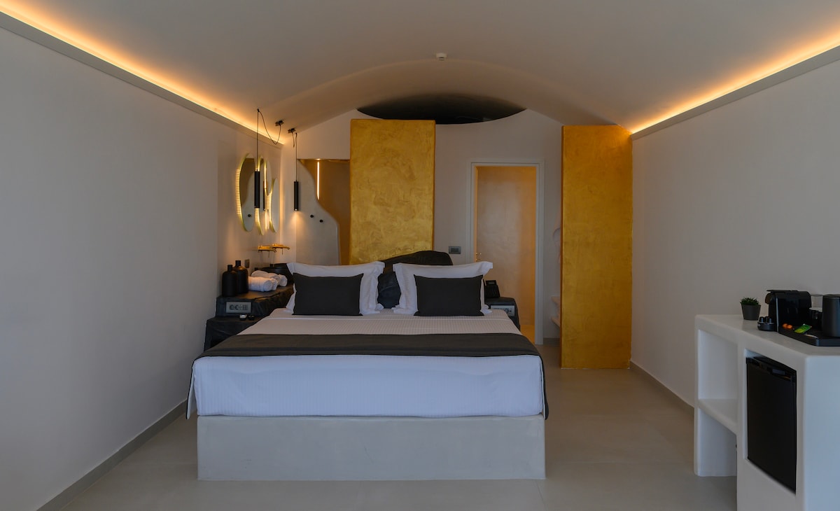 Esta suite premium de 48 m² con aire acondicionado en Kudos Suites Firostefani, a 10 minutos a pie de Fira (el corazón de Santorini) y la zona de Caldera, tiene capacidad para 3 huéspedes. Sumérgete en un jacuzzi privado de hidromasaje las 24 horas, los 7 días de la semana, relájate en una sala de estar con sofá cama, duerme en una cama tamaño king y refréscate en un baño con ducha, bidé y artículos de tocador. La suite ofrece guardarropa, cafetera, heladera, caja fuerte y TV inteligente. Disfrutá del desayuno en la suite, una piscina infinita compartida y estacionamiento público gratuito a 15 minutos: ideal para una escapada.