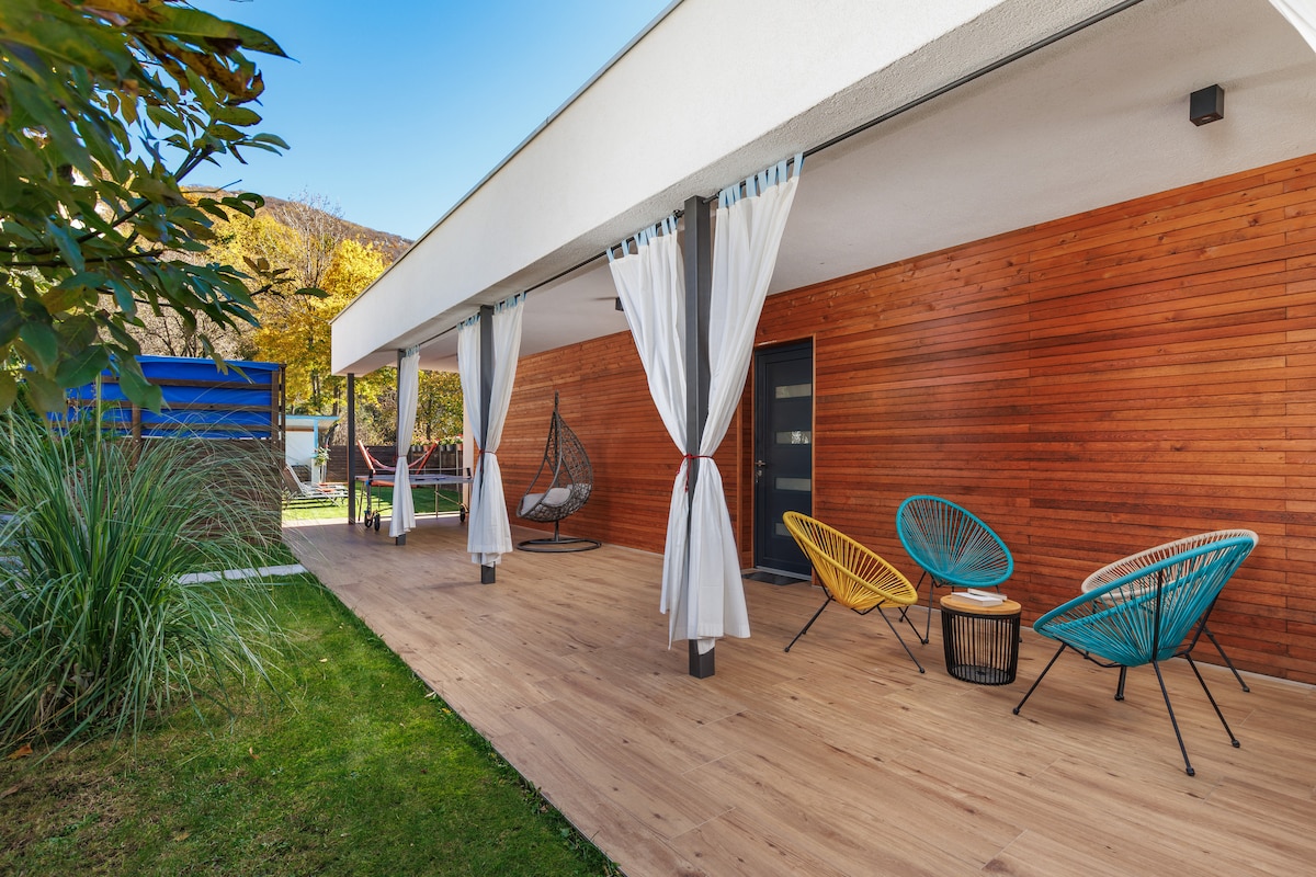 Tranquila, rodeada de naturaleza y una casa hecha con amor para las personas que desean escapar del estrés diario. Empieza el día tomando café en una de las tres terrazas y termínalo relajándote en el jacuzzi. Aprovecha al máximo tu día disfrutando en la playa de guijarros, haciendo una barbacoa o dando un paseo por los senderos del bosque. Si eres amante de la naturaleza virgen y buscas un lugar tranquilo para relajarte, esta casa es perfecta para ti.