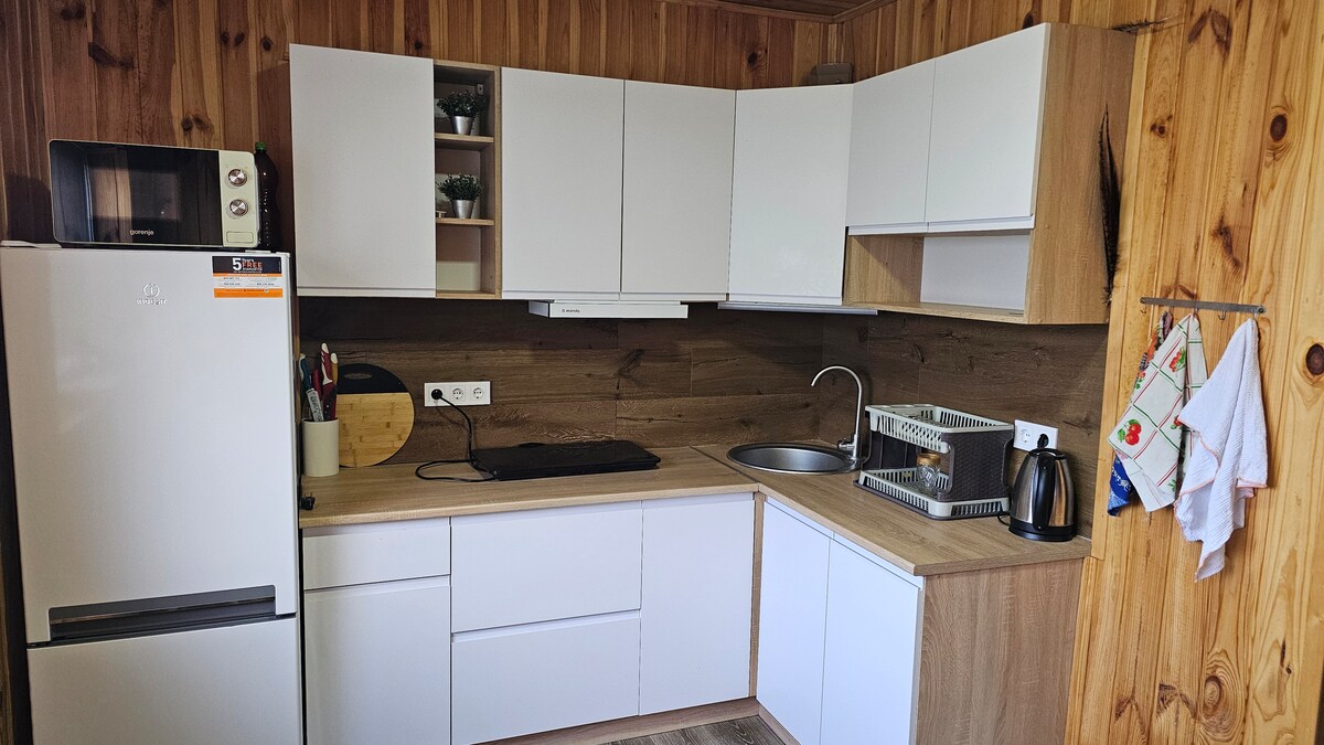 Уявіть собі ранок серед шелесту лісу, співу пташок і аромату свіжозвареної кави на терасі з видом на мальовничі пагорби. . З одного боку — тихий ліс, з іншого — безкрайній луг, де пасуться ягнята. Вілла розташована в повному усамітненні — жодного міського шуму, лише ви, природа і спокій. На подвір’ї — чан та бассейн із теплою водою під відкритим небом і панорамні краєвиди. Вечори — біля вогнища, під зоряним небом! Ідеально підходить для сімей з дітьми або романтичної втечі на двох.