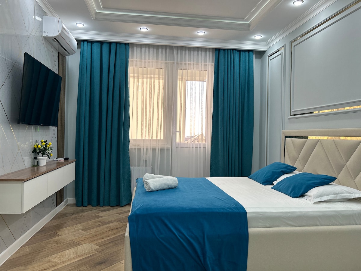 ¡Estimado huésped y residente de Shymkent! Te ofrecemos un apartamento CÓMODO Yde clase con un interior de diseño en el estilo neoclásico. El apartamento cuenta con todo lo que necesitas para tu estancia cómoda: muebles, electrodomésticos, ropa de cama y toallas limpias, equipados con albornoces y zapatillas. ¡Bienvenido, te estamos esperando! Saludos cordiales, Tu acogedor APARTAMENTO SHYMKENT