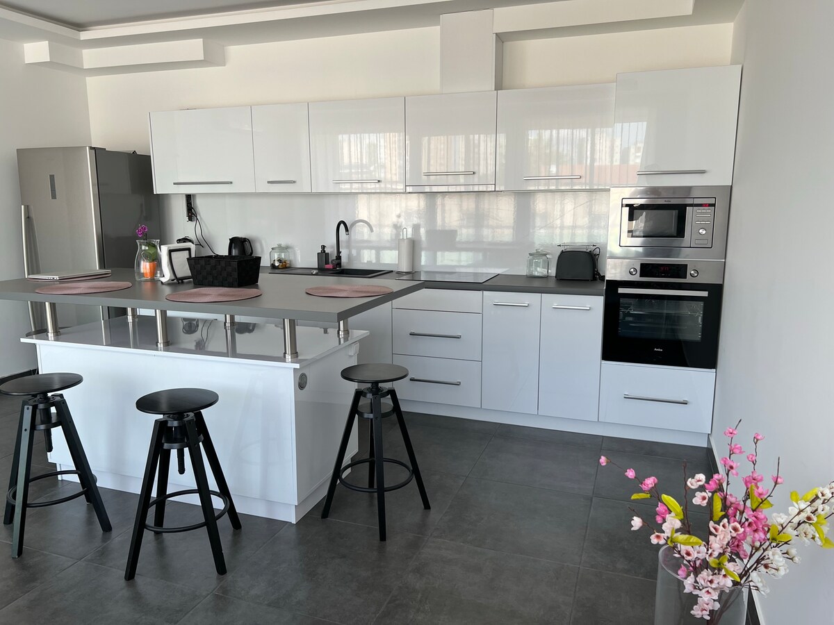 Apartamento moderno totalmente equipado, que en vivo es igual a las fotos. El apartamento está situado en el cuarto piso, hay ascensor. Si es necesario, proporciono aparcamiento gratuito. IMPORTANTE: ¡Por favor, indícalo en el momento de la reserva, porque la barrera se puede abrir con un mando a distancia! Hay wifi y Netflix disponibles en el alojamiento. El parque residencial también cuenta con un restaurante, una tienda y una farmacia. Hay secador de pelo, toallas, gel de ducha, ropa de cama, café y té en el alojamiento, ¡no los traigas contigo!