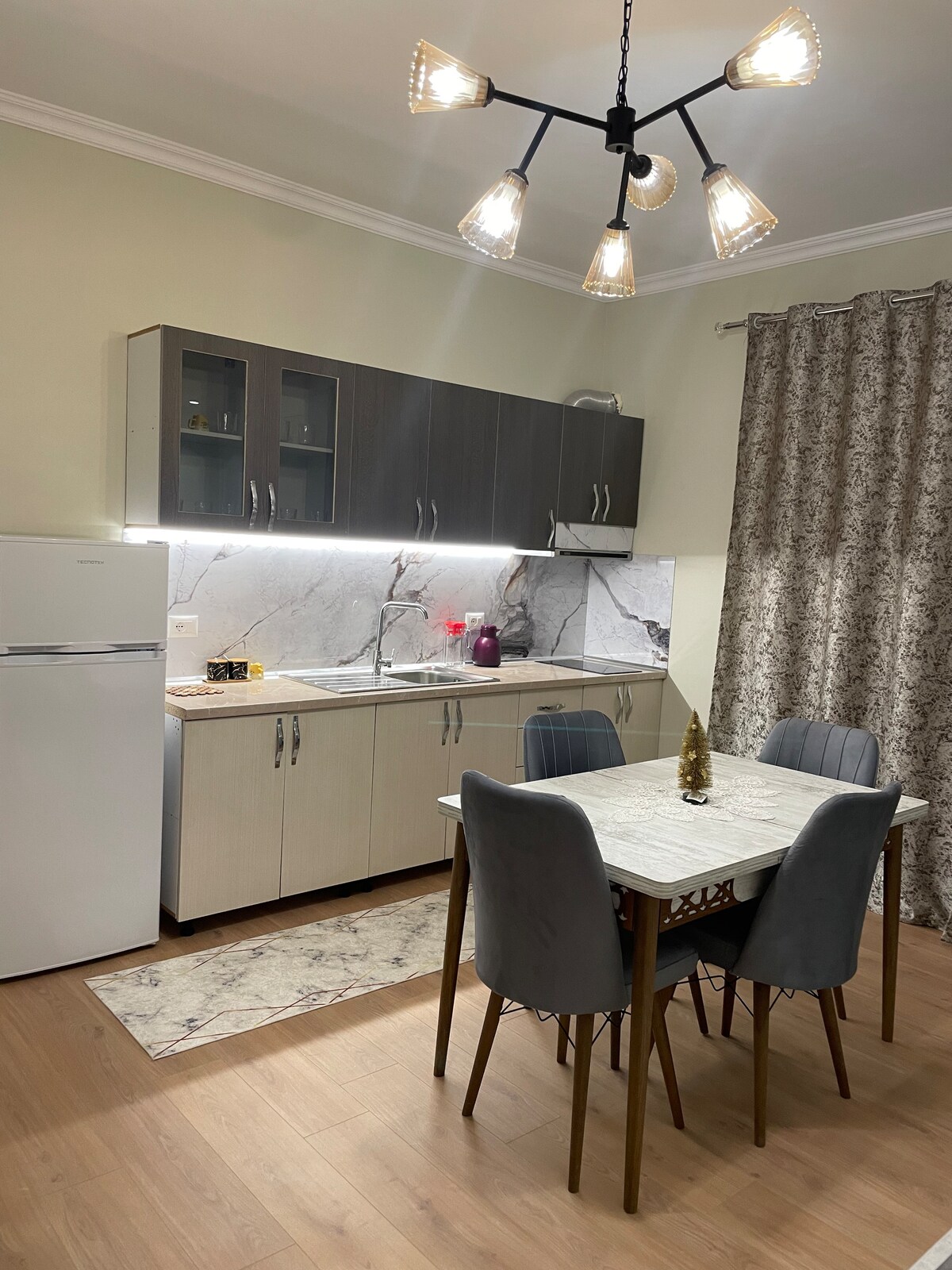 ¡Bienvenido a nuestro elegante y cómodo apartamento de un dormitorio, perfecto para parejas, viajeros solitarios o grupos pequeños! Situado en el centro de Kamëz, nuestro apartamento ofrece fácil acceso a todo lo que necesitas. A solo 10 minutos del Aeropuerto Internacional de Albania y a 15 minutos del centro de la ciudad de Tirana, es una base ideal tanto para viajeros de negocios como de placer. En el interior, encontrarás una cocina totalmente equipada, una acogedora sala de estar con un sofá cama y una decoración moderna y acogedora que te hace sentir como en casa .