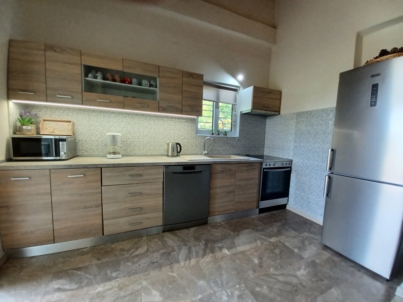 Esta atractiva y acogedora casa te espera con su sala de estar de espacio abierto y zona de cocina. Así como sus dos dormitorios. El edificio está situado de manera que permite a sus visitantes una magnífica vista sobre el valle del río Alfios y, en algunos días, también existe la posibilidad de echar un vistazo al brillo del mar detrás de las lejanas colinas.