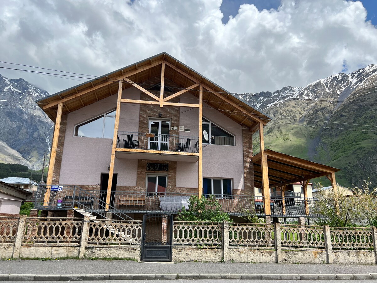Nuestro pequeño hotel familiar con impresionantes vistas a la montaña Kazbegi está situado a poca distancia a pie del centro de la ciudad. Estamos cerca de rutas de senderismo con paisajes impresionantes y a solo 2 horas de la capital, Tiflis. Cada habitación cuenta con: - baño privado (inodoro y ducha) para cada habitación - Balcón propio en cada habitación. - Acceso a internet. Organizamos múltiples caminatas/paseos guiados en el área circundante a petición. Quedamos a la espera de tu llegada a nuestro acogedor hogar.