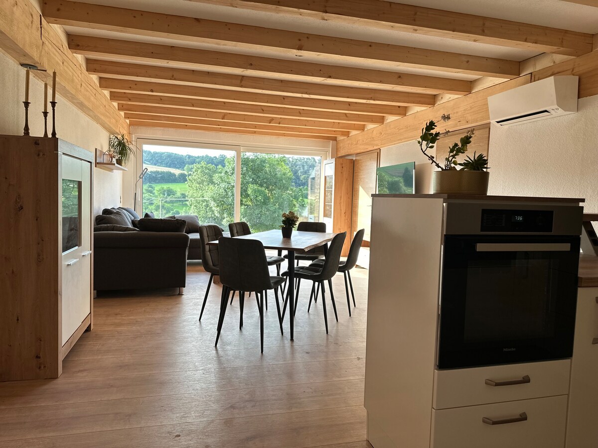 Die gemütlich rustikal eingerichtete 70 qm Ferienwohnung mit Küche inkl. Essecke und Wohnraum (mit Schlafcouch), 1 Schlafzimmer und 1 Bad liegt in unmittelbarer Waldnähe, ideal für Ruhesuchende über das ganze Jahr. Kinder und Haustiere (siehe Zusatzkosten) sind ebenfalls herzlich Willkommen. Eine Sitzecke mit Grillmöglichkeit befindet sich direkt vor der Ferienwohnung.