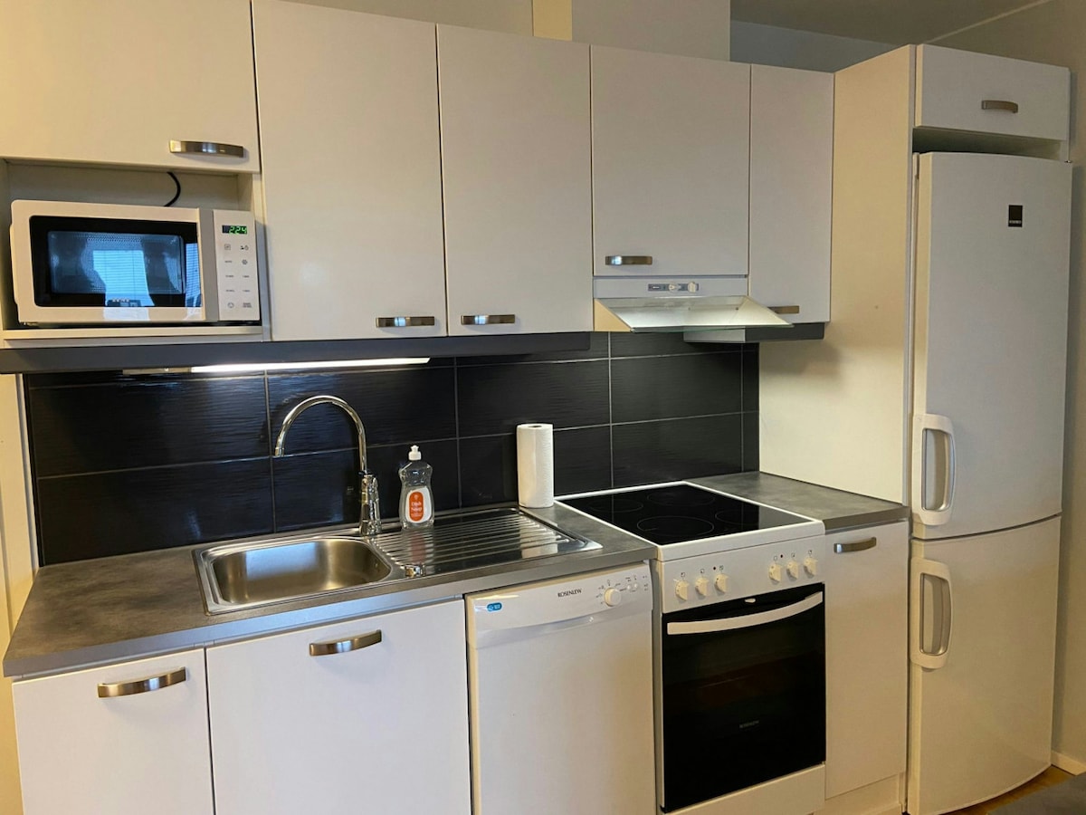 Bright and modern one-room apartment perfect for both short and long-term stays. Features two beds, a well-equipped kitchen, a cozy living room with TV, a washing machine, dishwasher, private sauna, and included parking. Ideal for a comfortable and convenient stay.