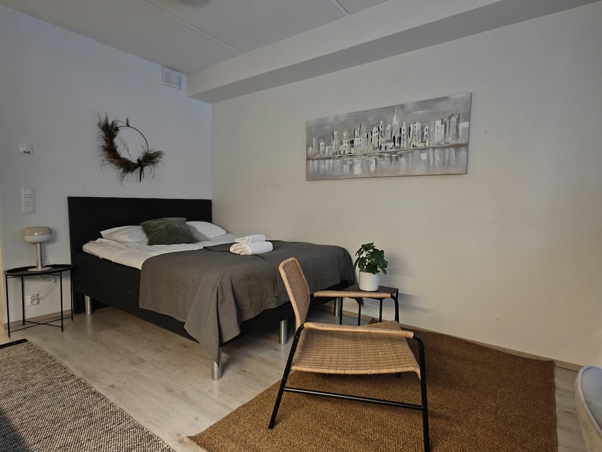 Cozy one-room apartment with a private sauna in the center of Kemi. Well equipped for both short and long stays, the apartment offers comfortable sleeping for two, a functional kitchen, and everyday conveniences such as a washing machine. Linen, Wi‑Fi, and parking are included for a hassle‑free stay.