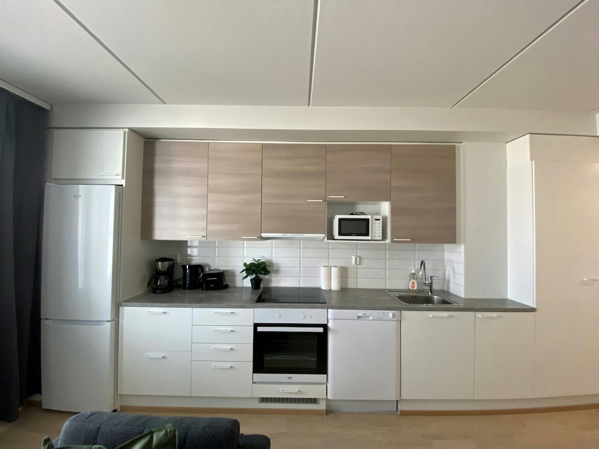 Stylish and modern one-bedroomroom apartment with sauna in the city center of Kemi. Perfect for long-term stays, featuring a well-equipped kitchen, cozy living room, double bed, wardrobe, and washing machine. Bed linen, towels, and parking included. Ideal location for convenience and comfort.