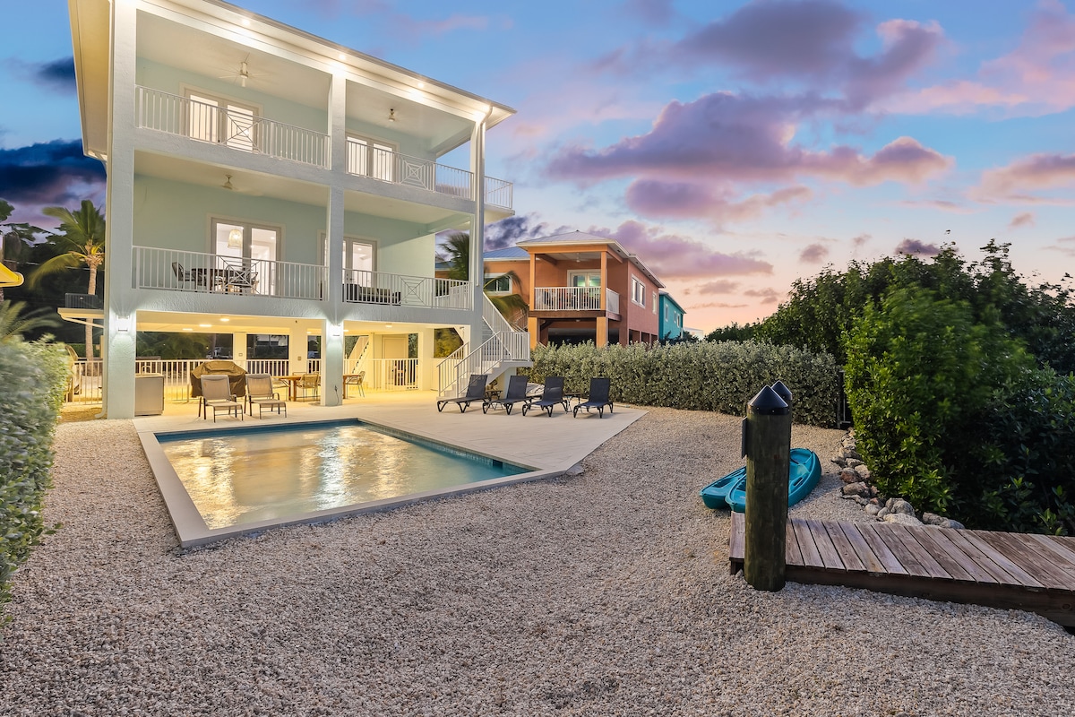 Escápate a esta nueva impresionante casa con piscina frente al mar. Disfruta de vistas panorámicas al mar, un muelle privado para barcos, zona de pesca, esnórquel, kayaks, tablas de paddle, bicicletas y mucho más... El espacioso y moderno interior cuenta con una cocina totalmente equipada, acogedores dormitorios y una sala de estar abierta perfecta para relajarse. Sal a un hermoso patio o dos balcones con asientos para disfrutar de las vistas. Ideal para varias parejas, familias grandes o amigos que buscan explorar lo mejor de la llave del maratón.