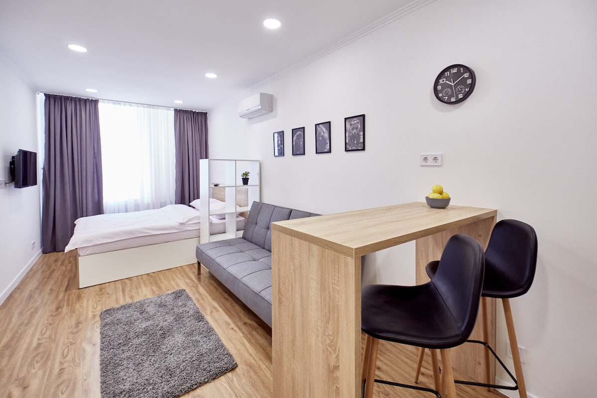 Затишна студія в історичному центрі Харкова, створена для комфортного проживання. Добре підійде для пари або одного гостя. У студії є кухня, душ, стабільний інтернет, чиста постіль і рушники. Простір теплий і доглянутий, підходить для короткого та тривалого перебування. Поруч кафе, магазини, громадський транспорт та укриття.
