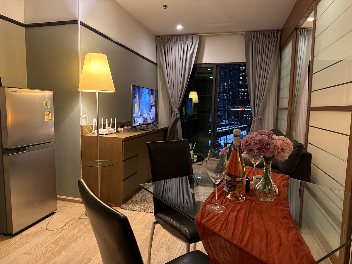 Bienvenido a mi casa, un apartamento superior de estilo hotelero en la ubicación privilegiada: zona de Ekkamai, a solo 200 metros de BTS Ekkamai, con piscina infinita en nube, un dormitorio en el centro de la ciudad, vida conveniente, ¡de alta gama! A 2 minutos a pie de la estación BTS Ekkamai, a 2 minutos a pie del centro comercial Gateway, piscina en la planta superior y gimnasio con excelentes vistas a la ciudad. Esta es una casa privada en el centro de la ciudad, con una superficie total de 35 metros cuadrados (incluido un balcón) con un dormitorio, un baño, un balcón, una zona de estar con sofá y un comedor.