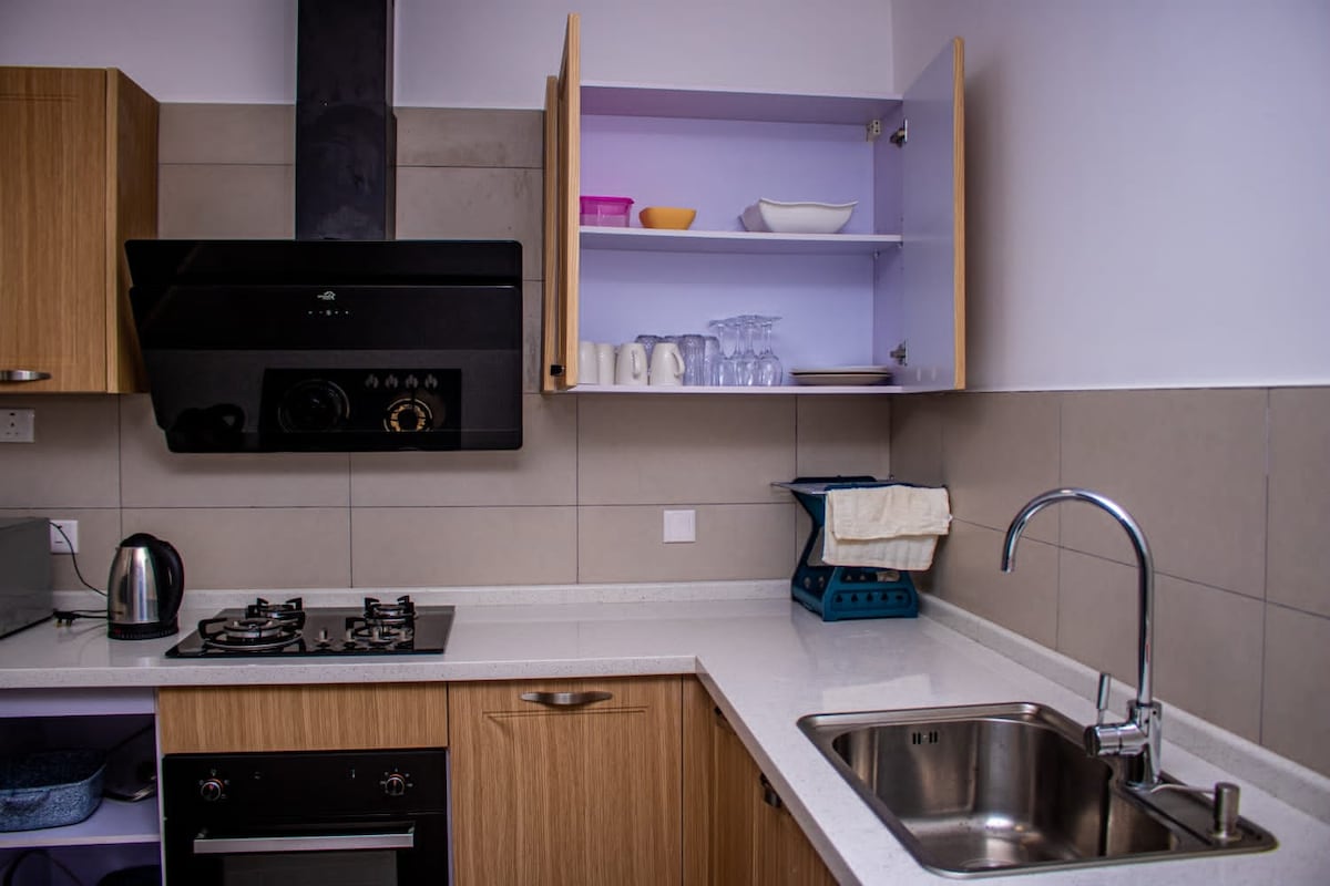 Acogedor apartamento estudio con servicios (Bamburi) amueblado. * Adecuado para 2 adultos y 1 niño o 3 adultos, amueblado con una cama tamaño queen y una cama individual. * Incluye aseo diario. * Mesa de comedor con cuatro sillas, sofá, mesa de centro. * Aire acondicionado *TV * Caja fuerte con llave * Balcón con dos sillas y mesa de centro * Cocina: nevera, microondas, hervidor de agua, cafetera, tostadora, vajilla y cubiertos. * Acceso a servicios: piscina, zona de juegos para niños, bar de playa, restaurante, gimnasio, playa, lavandería. * A 21 km del aeropuerto internacional de Moi. * A 26 km de SGR Mombasa.