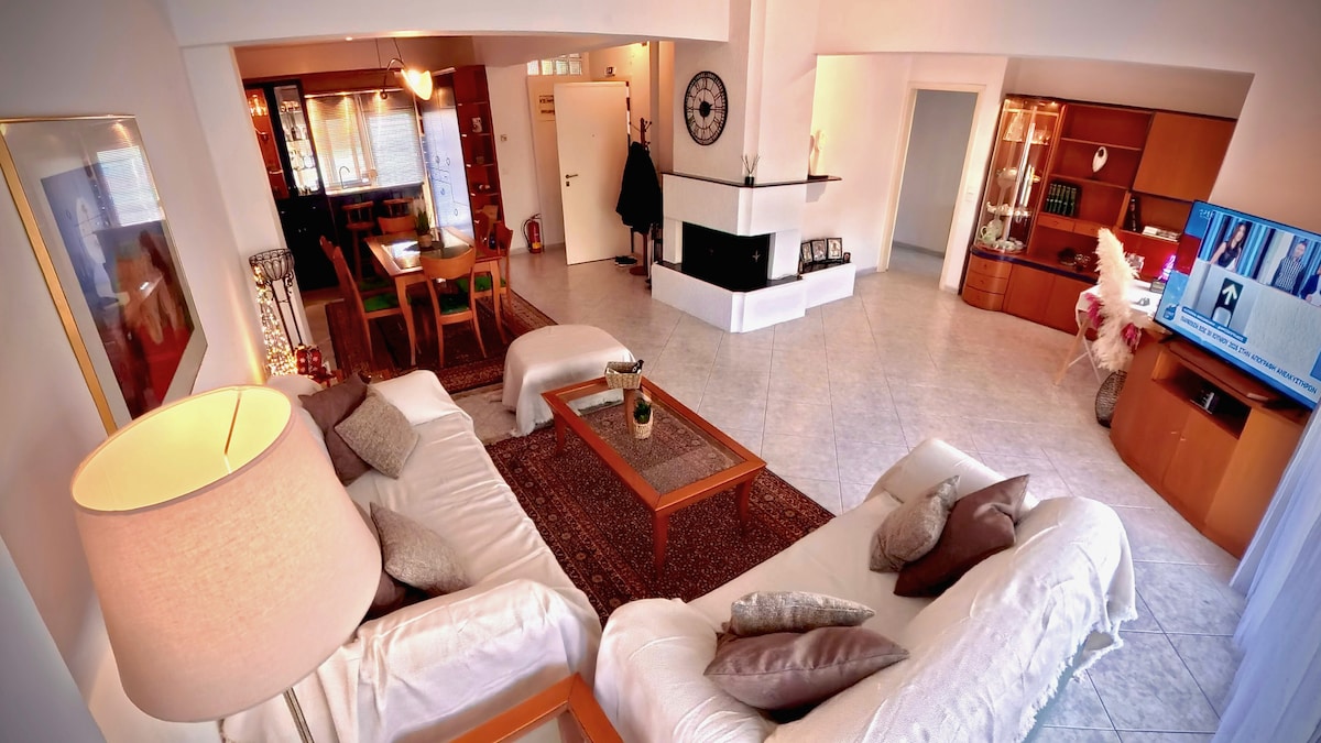 La casa está a 22 minutos (10 km) del centro de la ciudad, ya que se encuentra en las afueras de Tesalónica. Cuenta con dos amplios salones, dos dormitorios, baño y cocina totalmente equipada, así como un espacio especial para trabajar. El gran jardín vallado (200 m²) ofrece la oportunidad de relajarse y es ideal para niños y mascotas. Hay disponibles 2 juegos de parque y tronas.