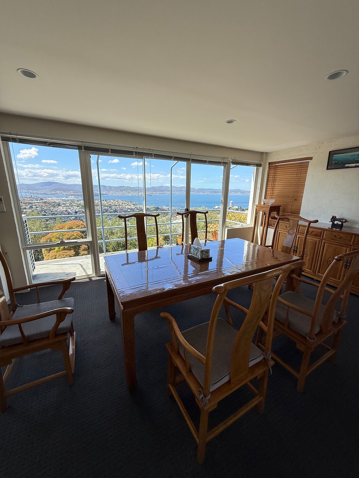This Modern Apartment with Queen bed ensuite comes with priority use of the new hottub & suits a couple (+2 with queen+single beds in Studio if needed). Located in the east end of the house. High above the D'Entrecasteaux Channel 195 Devlyns Rd. is on 13 acres with sweeping 360° views. Uninterrupted vista to Kunanyi (Mt.Wellington) to the North and The Tasman Peninsula to the East. In Simmis Studio:-8 ball and photo gallery. 2 beds for special purpose if needed. Tennis court with racquets.