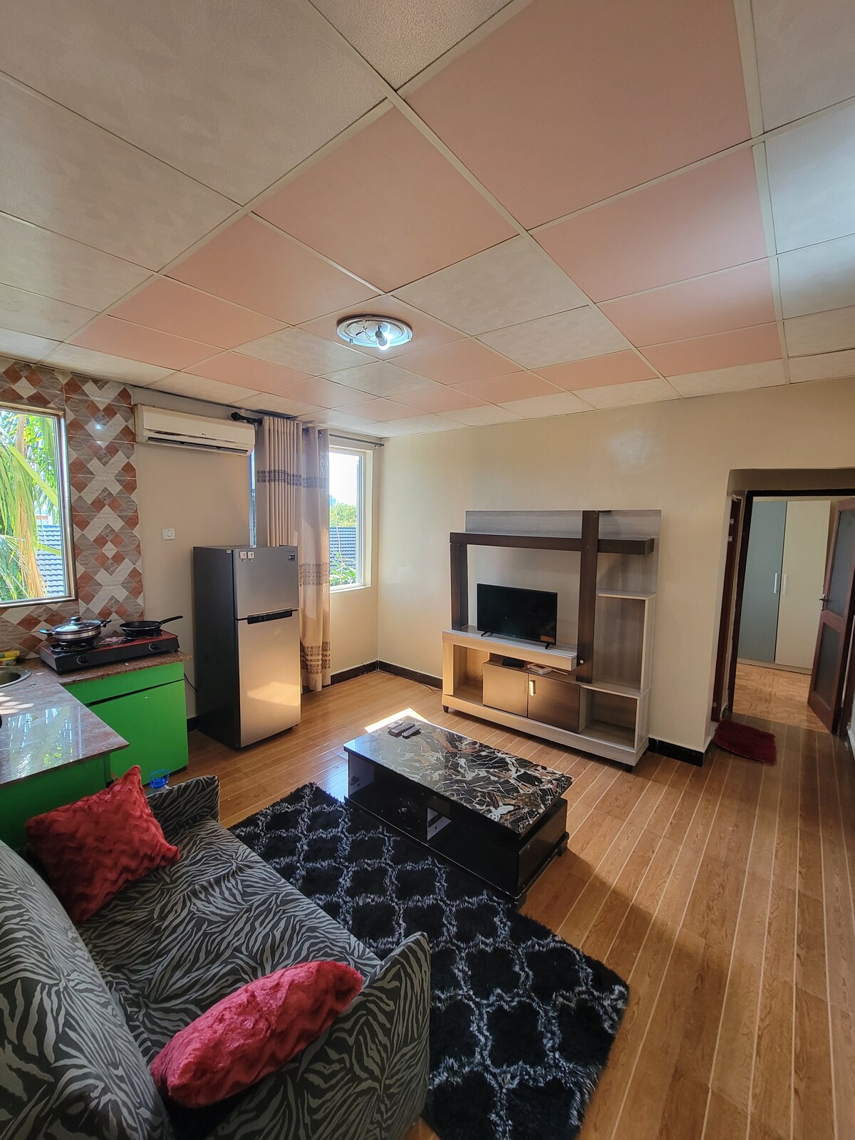 One Palm Centre apartment at Tabata Sanene, Dar es Salaam, Tanzania, is not just a place to stay; it is an oasis of luxury, comfort, and recreation. With its beautiful sitting room, smart TV, free Wi-Fi, sofa beds, air conditioning, Jacuzzi, bedroom with AC, open kitchen, and serene garden view with a lounge and food court, it provides the ultimate setting for guests to recreate, refresh, and create unforgettable memories.