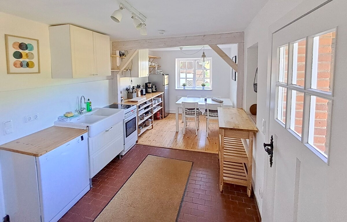 Die Fewo ist 50 qm groß und für 3 Pers., ein idealer Platz um ein paar schöne und entspannte Tage an der Ostsee (6 km) zu verbringen. Sie hat ein großes Wohnzimmer mit separatem Schlafbereich mit 180 x 200 Bett und Fenster zum Hof sowie einen schönen Küchenbereich mit Sitzecke und ein Badezimmer mit 90 x 90 Dusche. Es gibt noch ein extra Schlafzimmer 90 x 200 Bett und auf dem Hof ist ein Schuppen für die Räder.