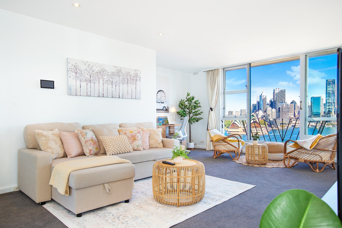 The listing recently updated from a single room to an entire apartment Wake up to breathtaking views of the Harbour Bridge, Opera House, and Sydney skyline. This 2B2B waterfront apartment features soaring 4-metre ceilings, filling the space with light. Located on prestigious Kirribilli Ave—just 300 metres from Prime Minister’s residence—the apartment blends modern luxury with curated art and designer furnishings. This artistic home was crafted by the Luna Bay Art & Design team.