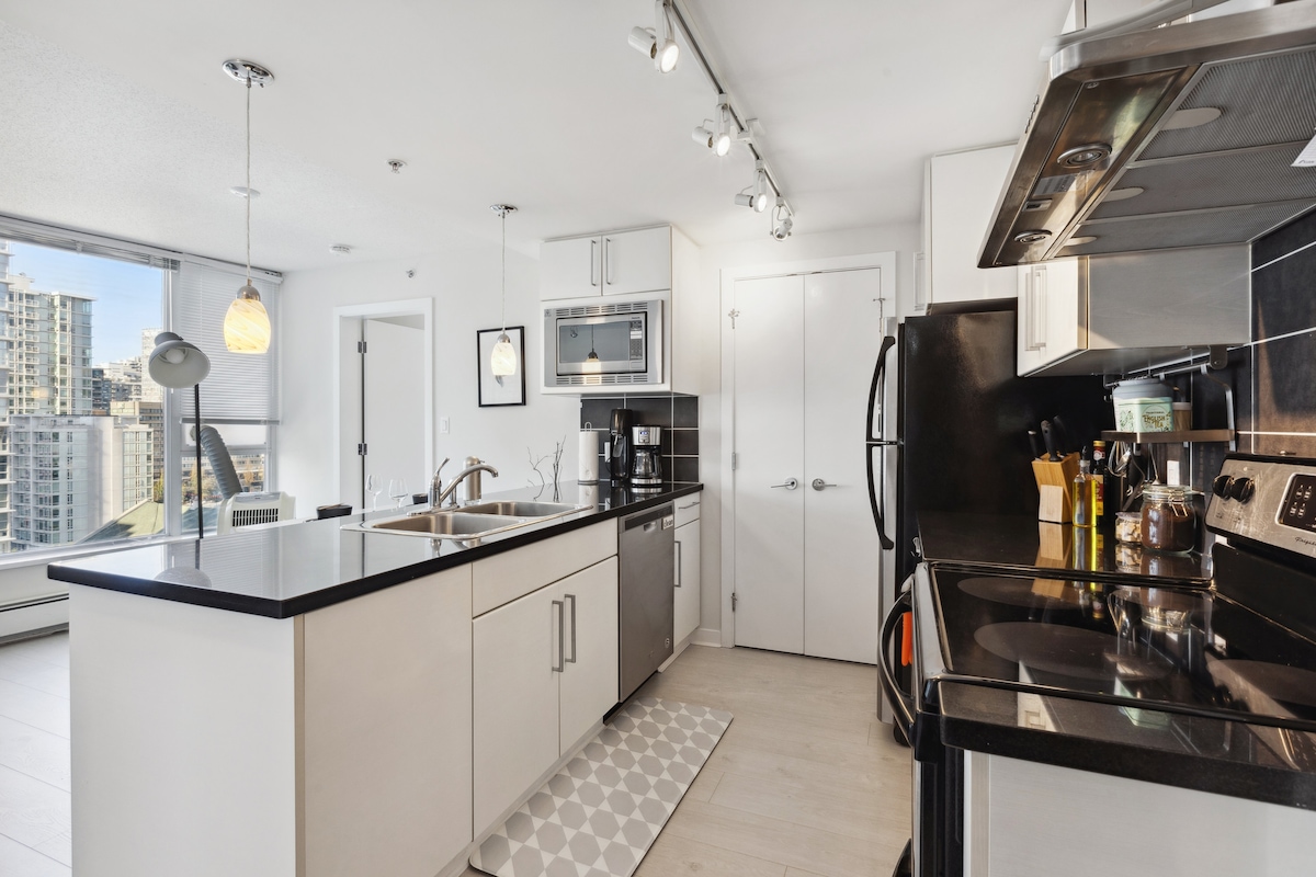Este hermoso apartamento es adecuado para profesionales de negocios, parejas, amigos y familias pequeñas. ¡2 dormitorios, 2 baños con lavandería en suite y cocina totalmente equipada para los amantes de la cocina! Con una ubicación céntrica, a solo 2 minutos a pie de la playa Sunset. A 10 minutos a pie de Yaletown. A 7 minutos en coche de Gastown. Deja que los niños chapoteen y jueguen en la piscina cubierta, mientras los adultos se relajan en el jacuzzi. También hay una pista de squash y un gimnasio totalmente equipado para uso de los huéspedes.