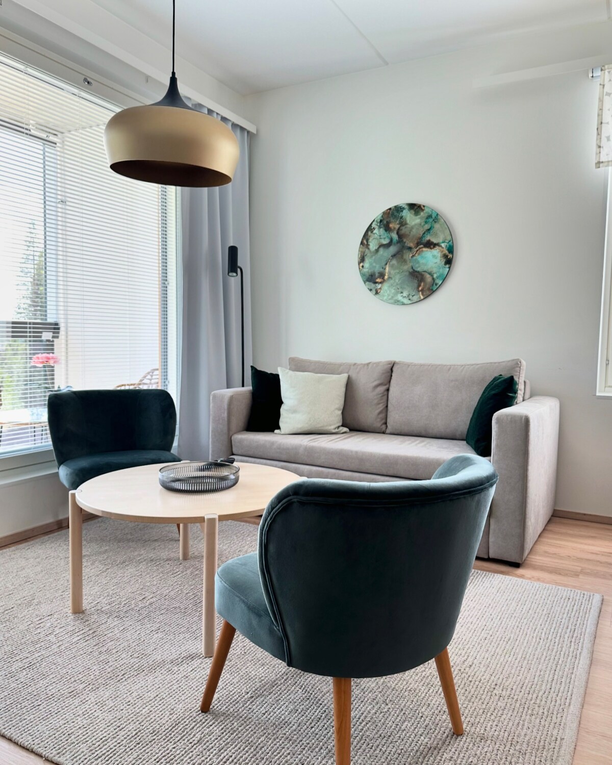 La cabaña ofrece cómodos espacios de alojamiento y una cocina bien equipada donde puedes preparar deliciosas comidas después de largos días. Hay dos dormitorios en la planta baja, uno de los cuales tiene camas separables. Arriba hay una litera grande, un aseo y un sofá futón plegable para una cama supletoria. La sauna se encuentra en un edificio exterior independiente, al que se accede a través de una terraza acristalada. También hay una chimenea al aire libre en la terraza, donde podrás disfrutar incluso de las noches más frías.