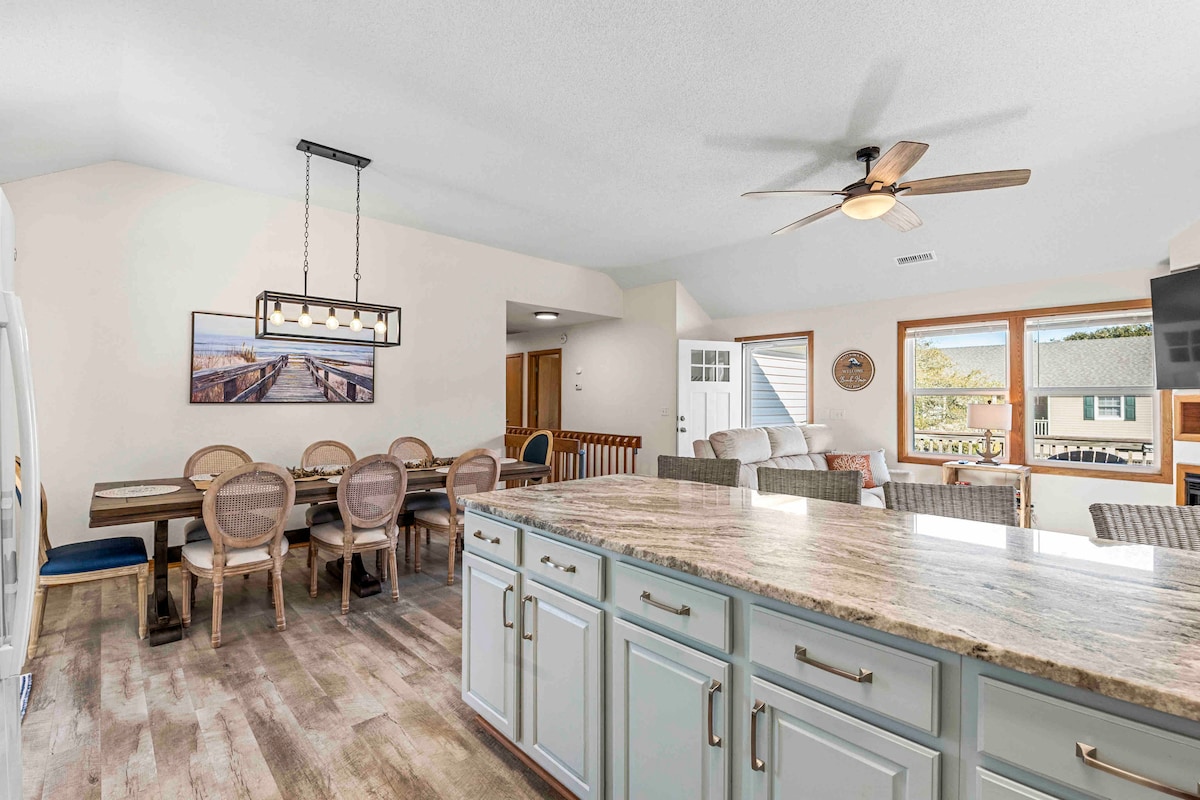 Esta es la unidad de arriba de una casa de dos unidades, y está situada en el centro de Kill Devil Hills, a unas 0,6 millas de la playa. El interior está elegantemente decorado con un plano de planta abierta y techos de catedral. Tiene una cocina completa con casi todo lo que se te ocurra, con una gran mesa de comedor y una isla de cocina. La sala de estar tiene un sofá envolvente hecho para relajarse y un televisor de 85 pulgadas con sonido envolvente Dolby Atmos 9.1 para relajarse y ver tus programas favoritos o algo nuevo.