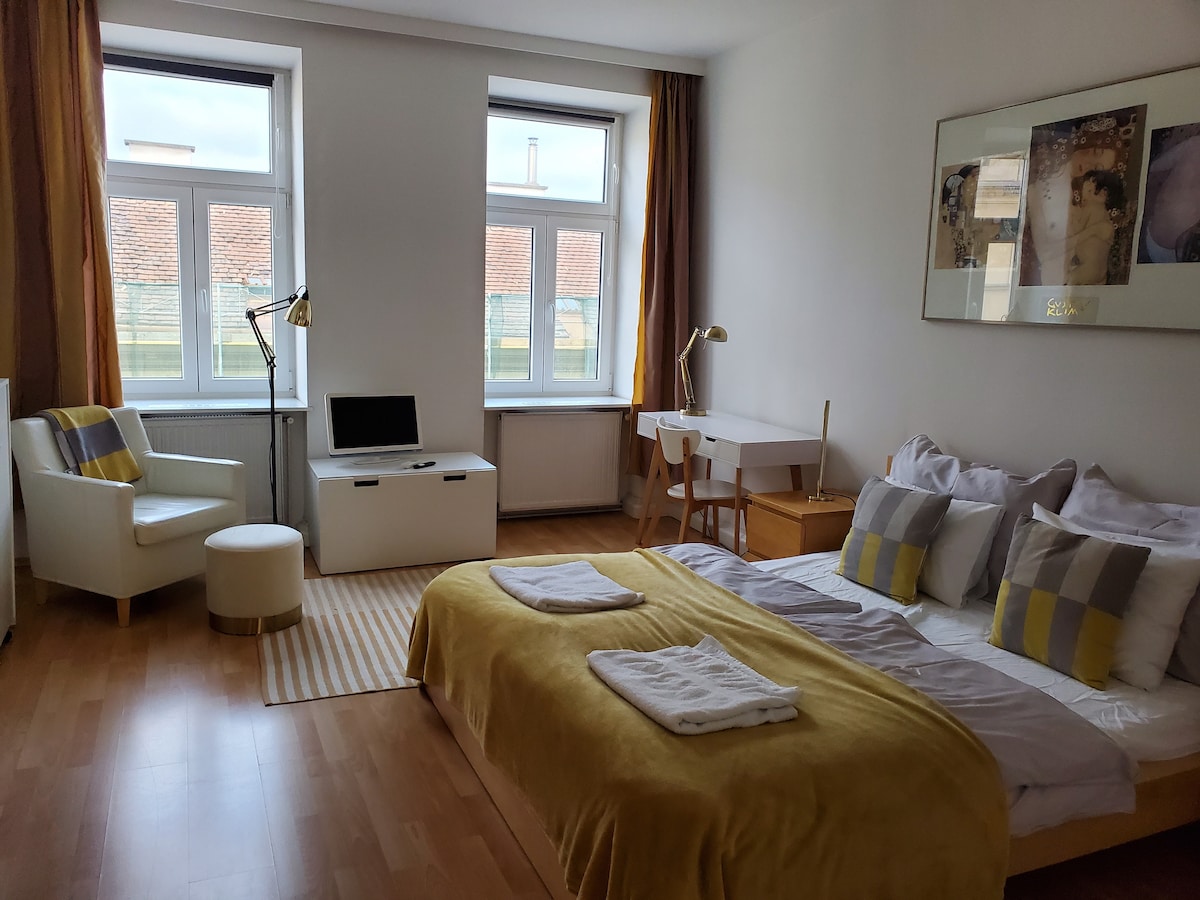 Vienna-Heights es un estudio directamente bajo el techo de una villa del siglo XIX en uno de los distritos más elegantes de Viena. Nuestra casa fue construida en 1897 y, por lo tanto, NO hay ASCENSOR. Se encuentra en el tercer piso. Serás recompensado por la subida con una vista maravillosa de la ciudad desde la terraza y la habitación. Cama doble grande y cómoda, sofá convertible para uno o dos huéspedes más. ¡Aire acondicionado! Autoregistro La estación de autobuses está a solo dos minutos a pie del centro. Se tarda unos 15 minutos.