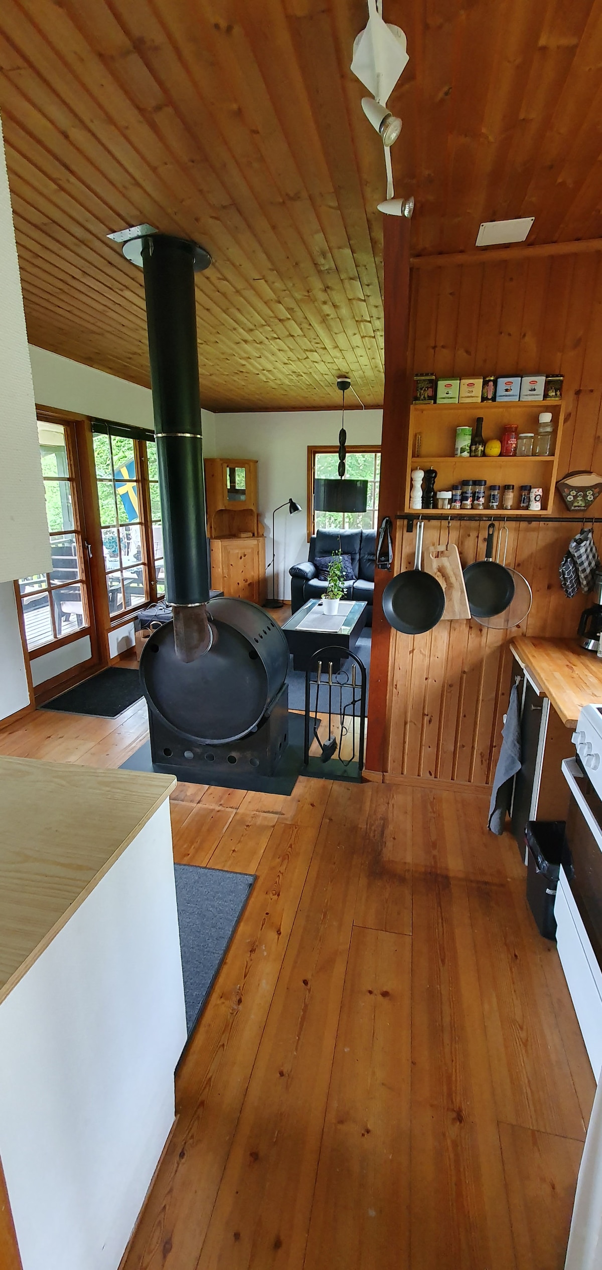Vive de forma acogedora y tranquila en una antigua casa de madera del siglo XIX. La ubicación es rural, con animales y naturaleza justo al lado de la puerta, pero al mismo tiempo cerca de la ciudad, restaurantes, entretenimiento, compras y playa/baño. Aquí vivirás tranquilo y espacioso en unos 120 metros cuadrados con 2 dormitorios, cocina, amplio salón con sofá, TV y comedor y baño con inodoro, ducha, lavadora y secadora. Junto a la casa hay un patio frondoso y privado con parrilla justo al lado de los pastos con ovejas y caballos. Puedes aparcar el coche justo fuera.