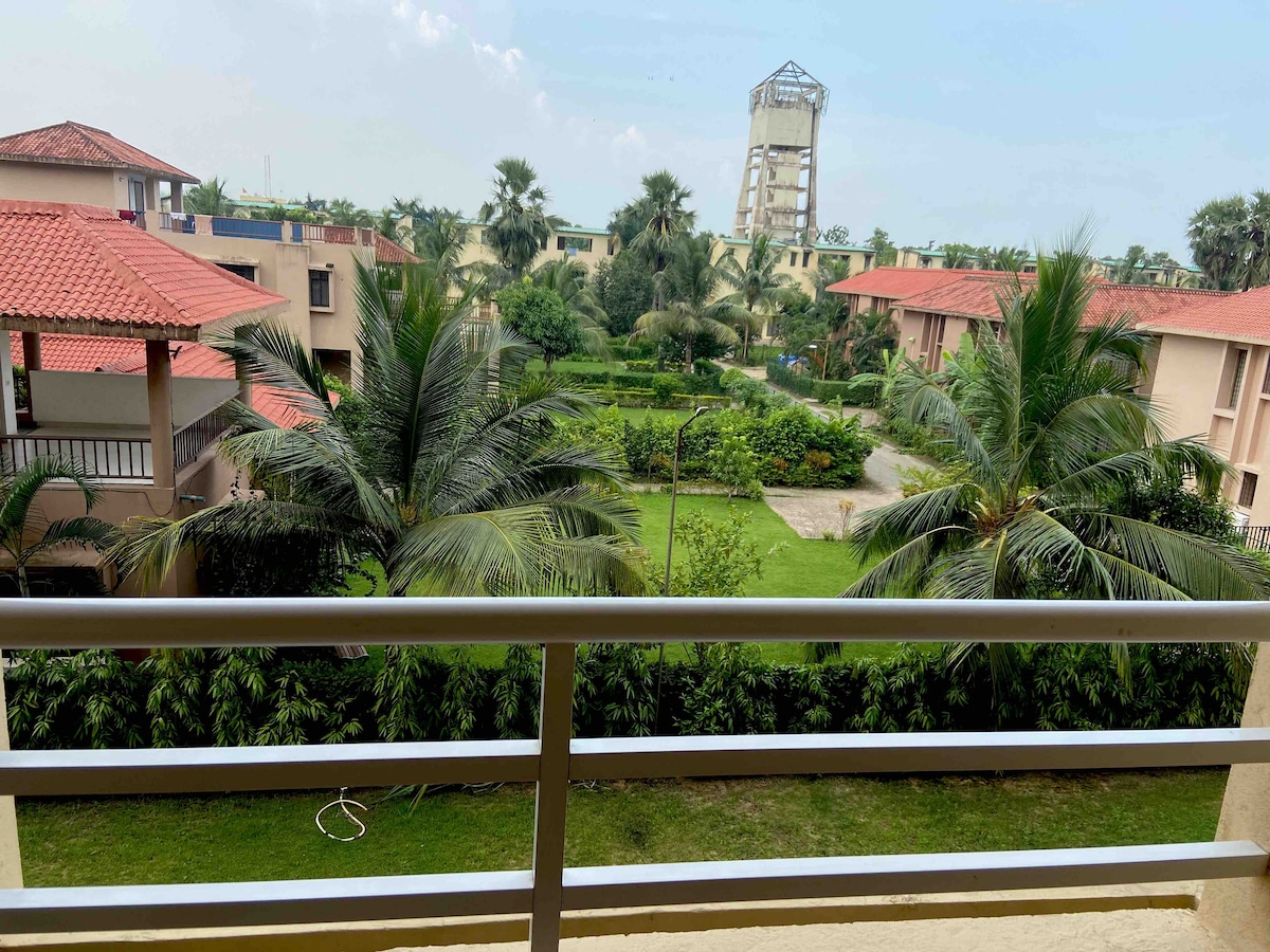 Estancias BLUO: ¡Casas desinfectadas galardonadas! Casa privada de 1 dormitorio con vistas al lago (500 pies cuadrados) en New Town, cerca de Biswa Bangla Gate y Eco Park, ideal para viajeros de negocios y de placer. Dormitorio con cama tamaño king, baño, sala de estar con sofá y comedor más cocina completa con placa de cocción, nevera, microondas, utensilios de cocina, etc. Tarifa diaria con todo incluido: internet wifi, Netflix/Smart TV, limpiador, lavadora, servicios públicos, estacionamiento, energía de respaldo, gimnasio, terraza y jardín!
