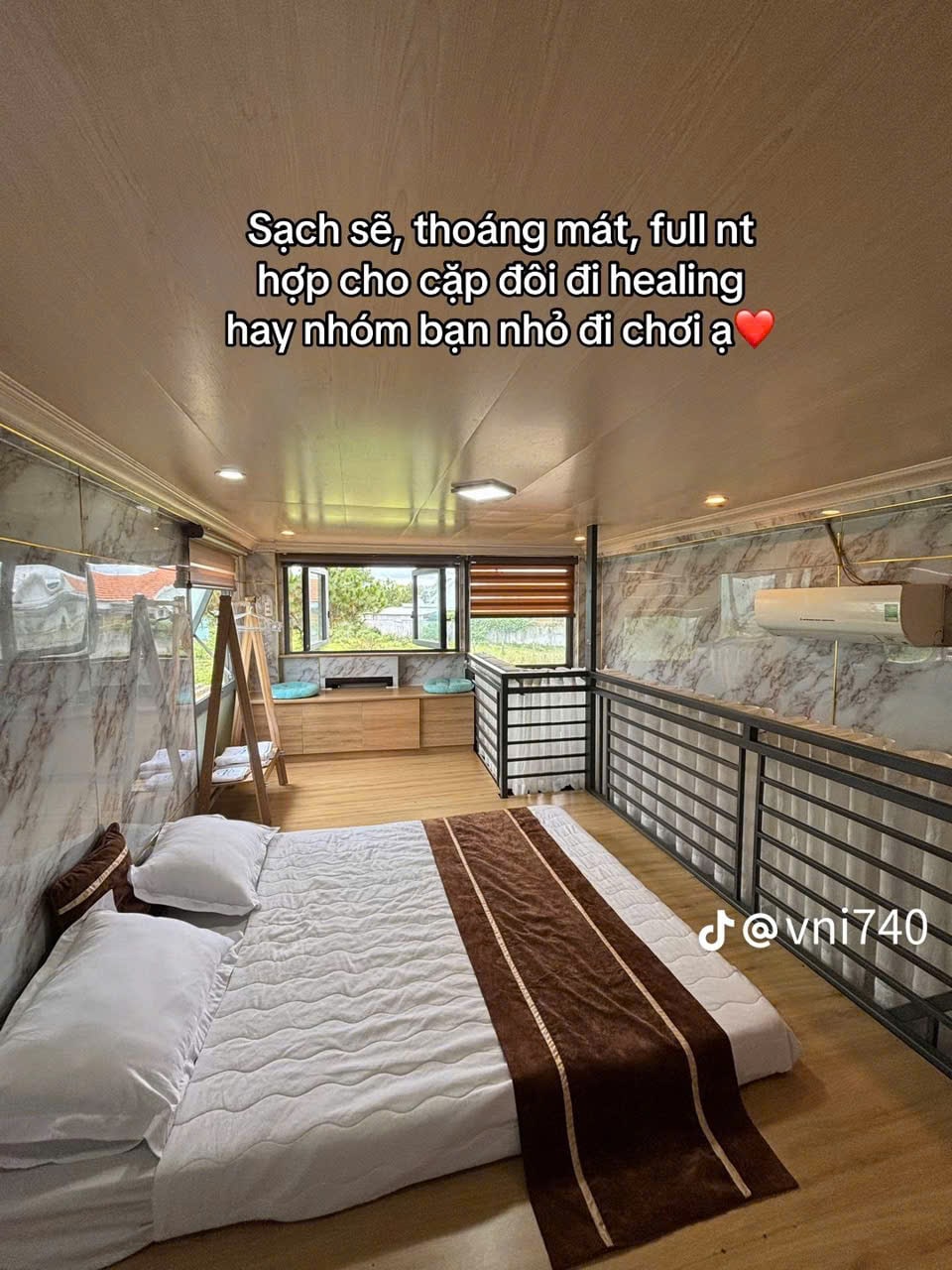 Ẩn mình giữa tán cây xanh, Gió Zen Balcony Loft là không gian nghỉ ngơi yên tĩnh với thiết kế ấm áp và tối giản. Phòng nổi bật với cửa sổ tròn đón ánh sáng tự nhiên, giường lớn êm ái và khu sàn nâng riêng để thư giãn. Ban công riêng nhìn ra tán cây xanh mát, lý tưởng để uống cà phê sáng. Trang bị điều hòa, TV thông minh, WiFi và phòng tắm riêng đầy đủ tiện nghi.
